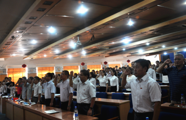 会后,公司举行“亮出党员身份” 集中佩戴党员标志牌和重温入党誓词活动。
