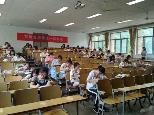 “管理一站到底”活动经过线上或者线下的方式进行报名。活动分为初赛和决赛两部分,以小组合作的形式进行。初赛的形式为笔试,笔试试题由单项选择题、多项选择题、判断题和简答题四部分组成,共计100分。此次考试于6月7号下午两点半正式开始,考试分为两场,第一场时间为2:30到4:00,第二场时间为4:20到5:50,最终根据笔试成绩来决定进入下一轮比赛的人员名单。考试前,首先由监考人员宣读考试注意事项:进入教室前,通过盗梦空间签到码签到。参试人员在工作人员的安排下入座。将校园卡或身份证置于桌面上。将手机交到工作人员处。答题完毕后即可立即交卷离场。