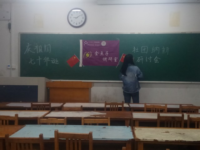 10月17日晚九点,金点子调研室于东校区三号教学楼204教室举办金点子调研室社团“庆祖国七十周年华诞”,及金点子调研室“纳新研讨会”。本次会议由金点子调研室会长黄小纯主持,主要通告并布置社团的将要承办的“百团大战”活动的安排,各部部长均参加。