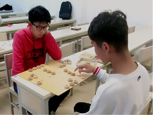 象棋赛场同学们热情高涨,双方横马跳卒,车攻炮轰,架起“当头炮”,暗伏“连环马”,对局当真是难解难分。双马饮清泉,小鬼坐龙庭,妙策频现,奇招百出。守道还如周伏柱,鏖兵不羡霍嫖姚。用如火如荼来形容今日的象棋比赛现场自是毫不为过。