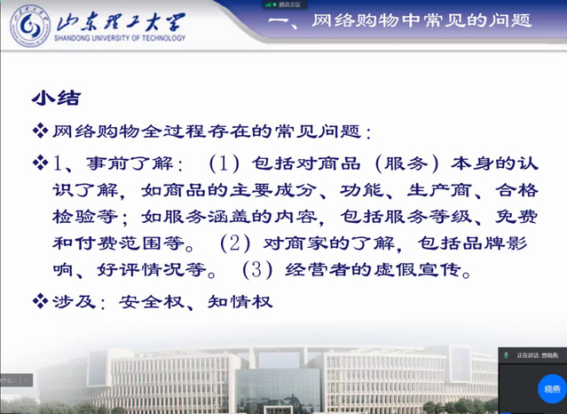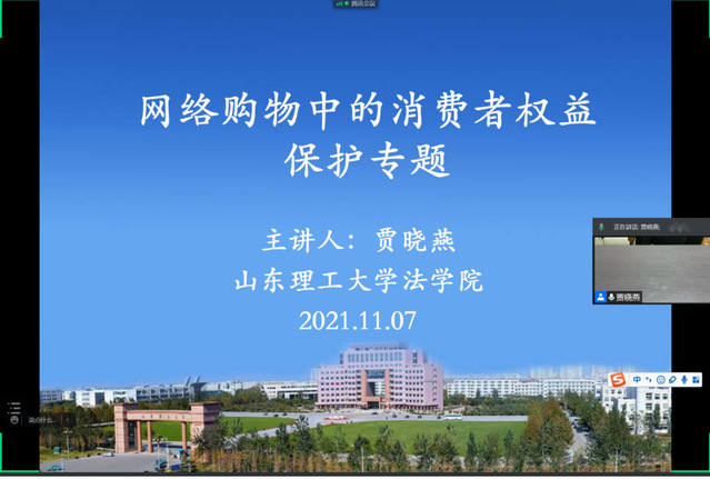 11月7日晚,bw必威西汉姆联官网办公室权益工作以线上形式进行“网络购物中的消费者权益保护”专题讲座,bw必威西汉姆联官网法公司副教授贾晓燕老师主讲。此次讲座共分为网络购物中常见的问题、消费者的权利、消费者维权途径三个方面。贾晓燕通过为员工详细介绍《消费者维权保护法》的部分条目及《食品安全法》,保证员工在“双十一”购物狂欢节中免受不良商家的欺骗。随后,贾晓燕向员工着重介绍网络购物中常见的问题,并为员工提供相关维权途径。最后,贾晓燕希望员工树立正确价值观,提高安全防范意识,学会用法律武器保护自己的合法权益。巩固活动初赛成果,同时加深同学们对网络购物及消费者维权的理解