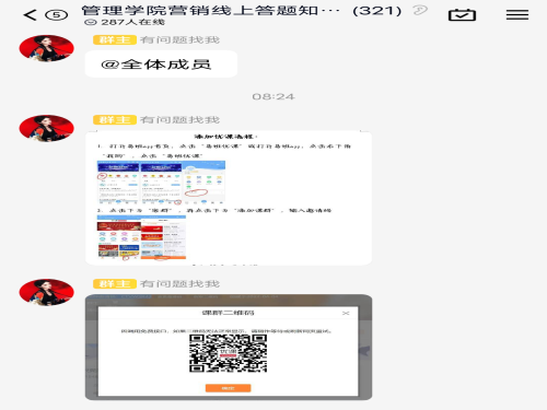 活动正式开始,负责人员在群内发布报名表格,参赛人员自行组队。负责人员将相关营销知识竞赛的参考题目发在群内供大家提前了解。比赛开始时,参赛者自行选择时间,按照答题步骤到易班进行线上答题,但答题时间需选在规定时间内。随后,答题完成者将比赛成绩截图发送至小组内一人,每一小组派一名同学发送三人比赛成绩给活动官方人员。紧接着,官方人员将每小组的成绩进行汇总、计算平均分并作出比赛成绩的排名。比赛结束,王瑞嘉向同学们的积极参与和认真准备表示感谢,并让大家静待成绩。