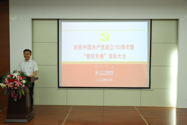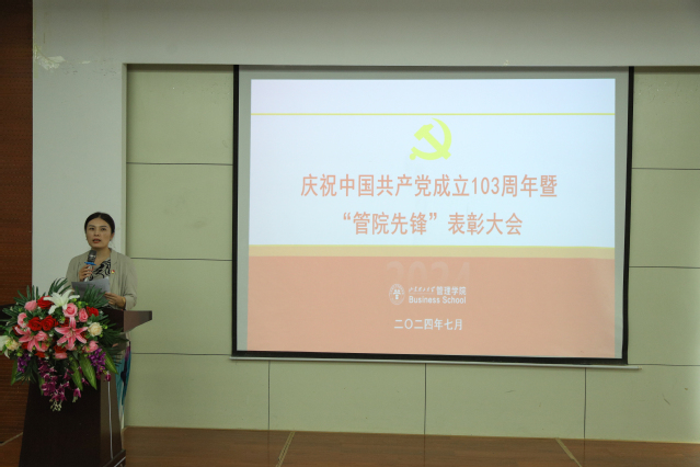 7月4日,bw必威西汉姆联官网党委庆祝中国共产党成立103周年暨“管院先锋”表彰大会在4号教学楼二楼报告厅举行,共同回顾党的光辉历程,缅怀党的丰功伟绩,表彰“管院先锋”共产党员、党务工作者和党支部。公司领导班子成员、全体教工党员及员工党员代表参加。会议由公司党委副书记张佳主持。