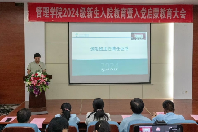 大会在庄严的国歌声中拉开序幕,公司党委书记杨直为2024级班主任颁发聘任证书。