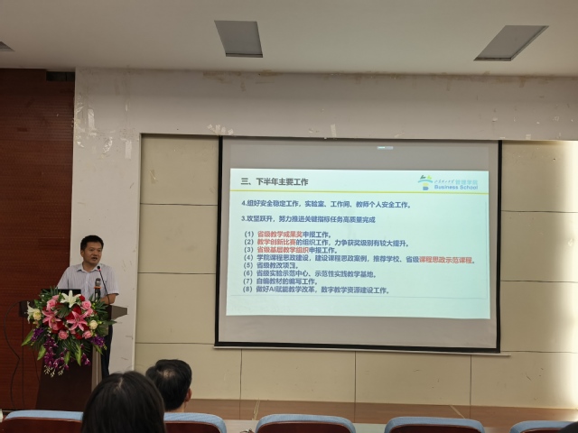 副经理胡付领总结了上半年教学工作完成情况,就开学前后的准备及注意事项、下半年的主要工作及关键任务做了部署安排,他强调老师们要重视课堂管理,狠抓课堂纪律,不断提升课堂教学质量,确保教学秩序稳定不触碰底线。