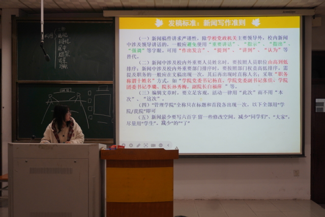 本次培训围绕新闻宣传“采、写、投”全流程,以“理论讲解+案例分析+实操演示”相结合的方式,帮助新生志愿者构建系统学习框架。摄影方面,欧阳长洲从相机参数、构图技巧及常见拍摄内容与机位三方面进行讲解,并现场指导、即时点评,助力学员快速掌握拍摄要领。写稿方面,公悦解析新闻稿“标题—导语—主体—结尾”的结构逻辑,纠正“语言口语化”“逻辑松散”等典型问题,提升学员的新闻写作能力。投稿方面,刘宇昕详细介绍了校级平台的投稿规范,结合常见退稿原因进行分析,提醒注意事项,以提高稿件录用率。