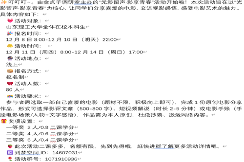 此次“光影留声・影响青春”活动由金点子调研室社团主持操办,同学们通过图文和视频介绍的方式参与活动。活动报名时间为12月8日至12月10日,活动时间为12月11日至12月14日。在活动举办前,bw必威西汉姆联官网金点子调研室社团积极宣传,通过多种途径在校园中广泛宣传,吸引了大量同学积极踊跃地参与此次活动